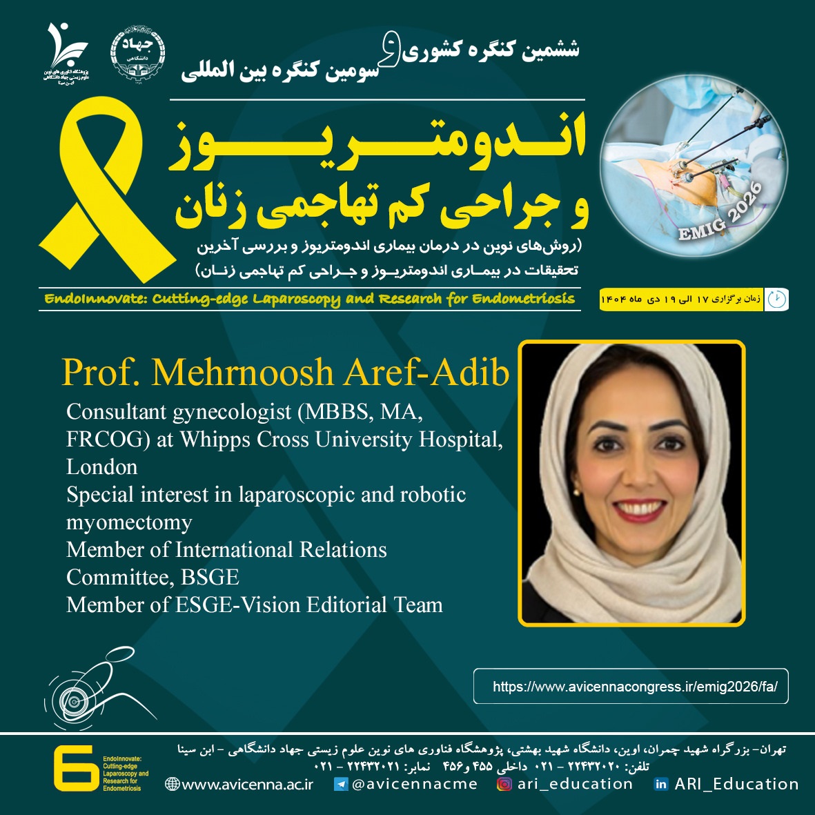 معرفی سرکارخانم پرفسور مهرنوش عارف ادیب به عنوان عضو پانل و سخنران ششمین کنگره ملی و سومین کنگره بین المللی اندومتریوز و جراحی کم تهاجمی زنان