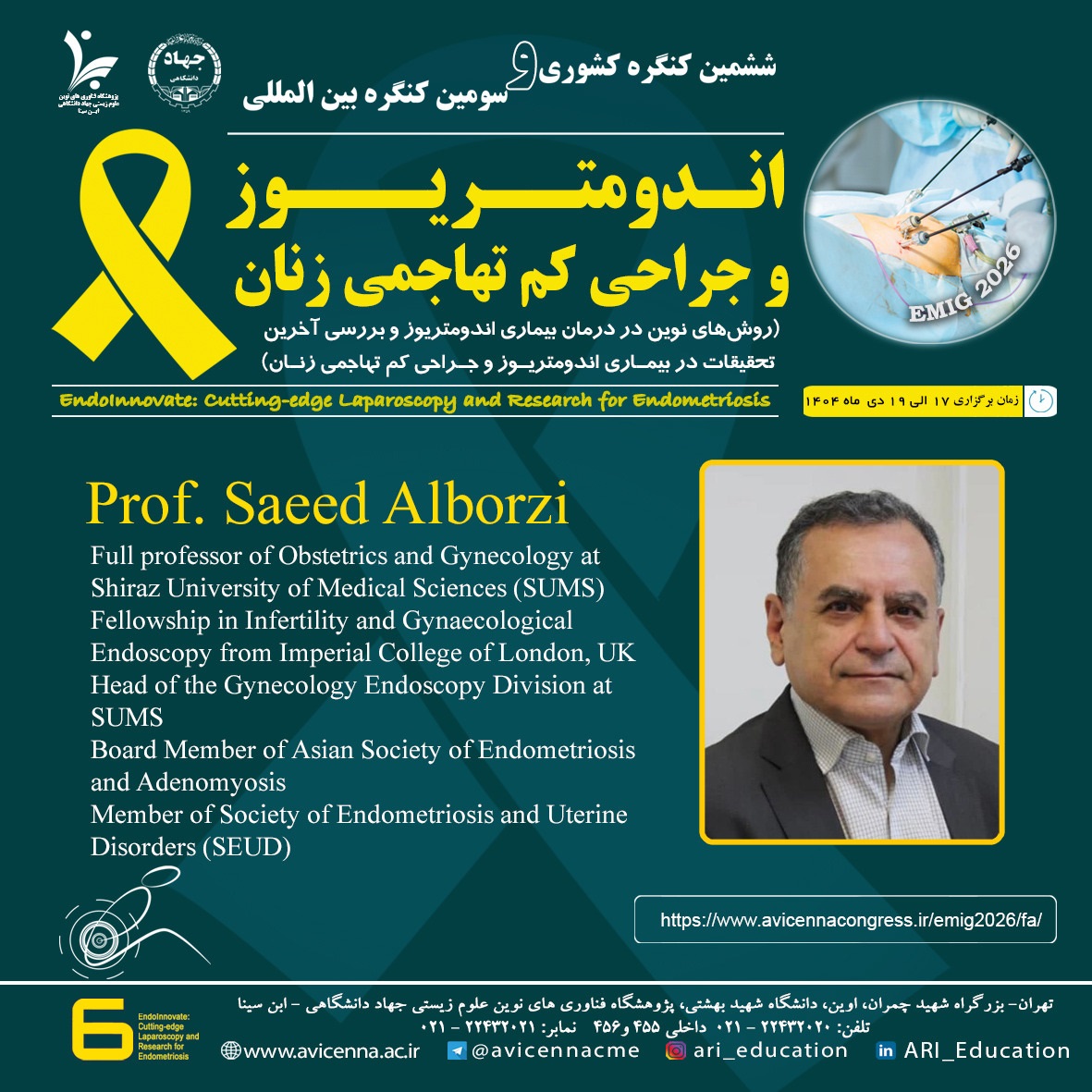 ششمین کنگره کشوری و سومین کنگره بینالمللی "اندومتریوز و جراحی کم تهاجمی زنان" که توسط پژوهشگاه فناوریهای نوین علوم زیستی جهاد دانشگاهی - ابنسینا از تاریخ ۱۷ تا ۱۹ دی ماه ۱۴۰۴ در سالن همایشهای بینالمللی دانشگاه شهید بهشتی تهران برگزار میشود، میزبان حضور پرفسور شاهین...